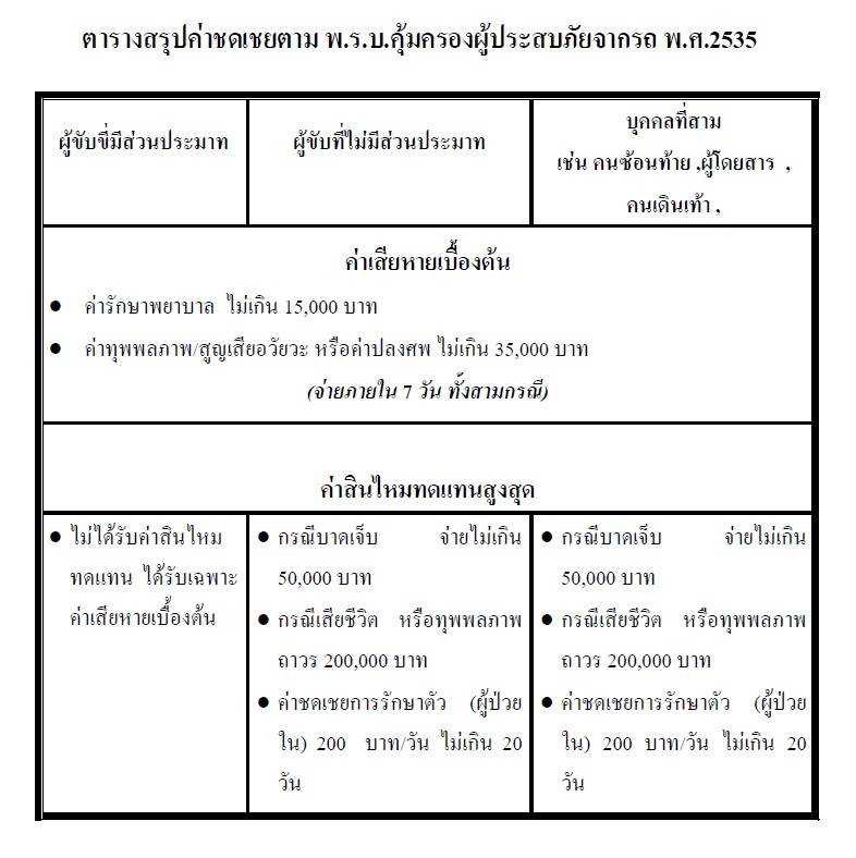C) จิตอาสาท่านหนึ่ง จากเว็บไซต์ sobsuan.com ได้สรุปเป็นตารางตาม พ.ร.บ.คุ้มครองผู้ประสบภัยจากรถ ดังนี้ ......click.....