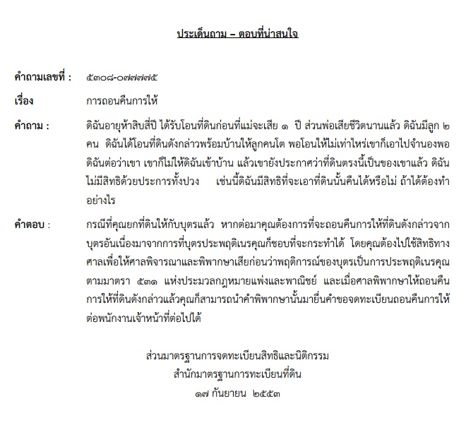 ลูกคนที่ 2 ซึ่งเป็นลูกชายคนโต และลูกคนสุดท้ายที่เป็นลูกสาว พาแม่ไปปรึกษากับทนายในจังหวัดนครศรีธรรมราช ว่าจะถอนคืนการให้ เพื่อนำที่ดินดังกล่าวมาแบ่งให้กับลูกคนอื่น ๆ ซึ่งมีฐานะด้อยกว่าลูกคนที่ 5 ซึ่งเป็นผู้รับการให้