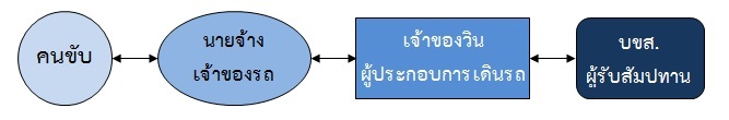 | เจ้าของวินรถตู้ น่าจะเป็นบุคคลเดียวกับผู้ประกอบเดินรถร่วม หรือผู้ประกอบการขนส่ง | ต้องร่วมรับผิดชอบกับคนขับรถตู้และคนขับรถพ่วง18ล้อ |